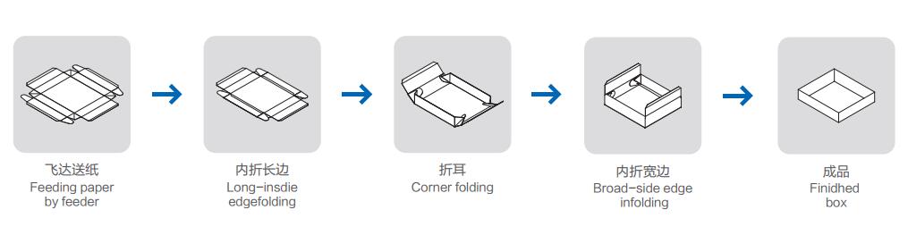 本機采用伺服控制系統(tǒng)、可編程PLC程序控制系統(tǒng)、人機界面控制系統(tǒng),實現(xiàn)卡紙折盒一次性成型。結(jié)構(gòu)緊密,操作簡單,生產(chǎn)效率高。主要適用于250—400g白卡紙、牛皮紙等包裝材質(zhì)的紙盒成型。廣泛應(yīng)用于化妝品、針織品、烘培食品、玩具、水果、日用品、醫(yī)藥等行業(yè)中的中高檔紙盒包裝。